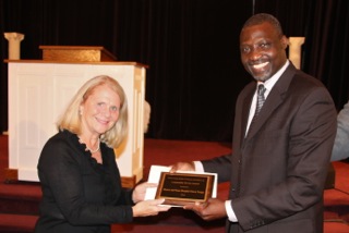 On behalf of Hearts & Noses Hospital Clown Troupe, Jeannie Fawcett (Happy Heart) accepted the Community Service Award from the Greater Boston Sickle Cell Disease Association during the Sickle Cell